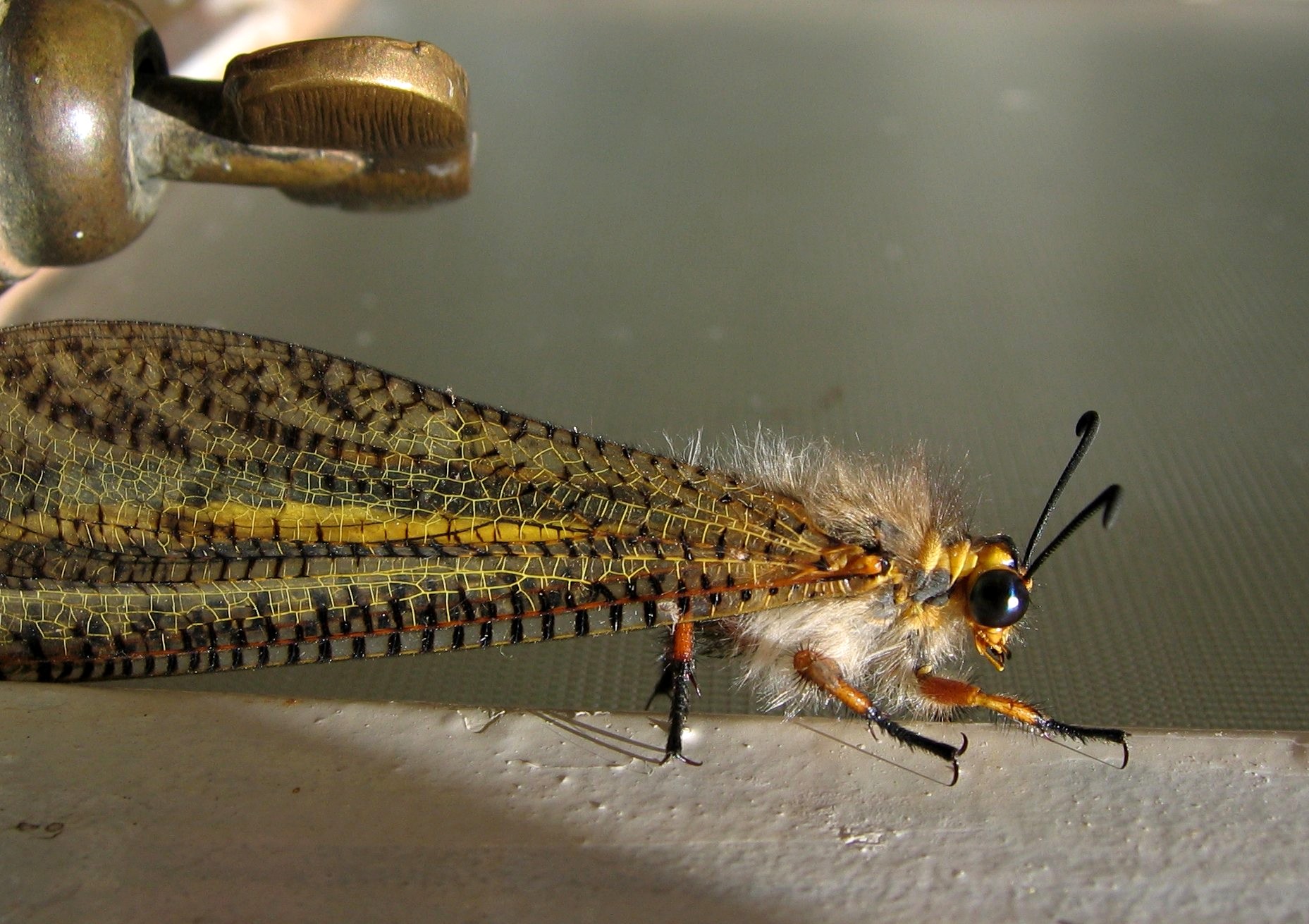 This is a picture of an antlion adult that I took earlier this year. It is Palpares sobrinus; isn’t she a beauty? The photo should be vertical but it fits better on the screen this way. It spent the entire day on my bathroom window patiently being photographed. My camera is a Canon Ixus 500 (5 M pixel pocket type) and it has an extraordinary macro facility for such a small camera. Yes, I did use a Unilock tripod that has independently moving legs that allow one to put the camera just about anywhere.