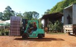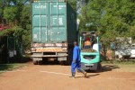 He duly did and they weren’t cheap but the container of coir from India had come through from the port in Beira a lot quicker than I’d expected so I had no chance to shop around. I agreed and waited for the container to arrive which it did around 9 a.m. on Friday. By 10 a.m. there was still no sign of the forklift so I got back to Herbert who was as puzzled as I was. A bit of phoning around and we managed to contact the forklift driver but then lost the signal. I started to wonder if they were lost, it doesn’t take THAT long to get out from the industrial sites. By 11 I was distinctly annoyed and wondering if there was an alternative way to offload the container. I got another phone number off Herbert and managed to contact the driver’s assistant. They were some 2km down the road so would be here shortly. It was a noisy phone call with what sounded like a very noisy gearbox in the background. It really didn’t sound good. 10 minutes later they were still not in sight. I wondered about the gearbox sound and then the penny dropped; they were driving the forklift on the road – I’ve heard them and they make that sort of sound. I couldn’t believe it but shortly a small blue forklift appeared on the road to the nursery. They really had driven across town in a forklift!