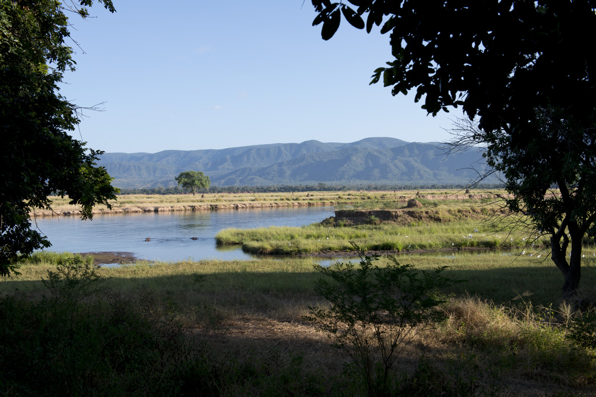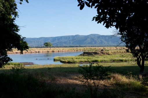 The view from the lodge looking over the hippo pool and a very small part of the Zambezi to Zambia in the background.