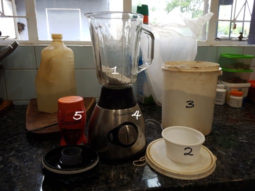 1. The fertilizer. We use single super-phosphate fertilizer at the nursery as the supply for phosphorus in the coir growing medium. It’s much cheaper than the soluble forms so it’s mixed into the coir after the former has been expanded and washed by means of a locally made drum mixer. Because the cells in the seedling trays are small, a powdered form of the single supers as it’s known is preferred to ensure that it’s mixed uniformly into the coir so some will end up in every cell. The powdered form of the single supers is no longer available but I did manage to buy  some of an imported granular version which is more normally used for field applications as the granules are easily and uniformly distributed by machine. So I had to get creative with a blender/liquidiser.