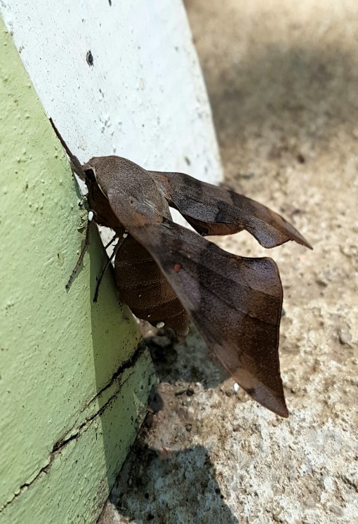 A hawk moth. It looks remarkably like a pod of a musasa tree that are throughout the lodge garden.
