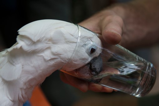 Endlessly entertaining. This is an Indonesian white cockatoo. A large number of the domestic animals here have at one time been pets that have proven to be difficult to keep.