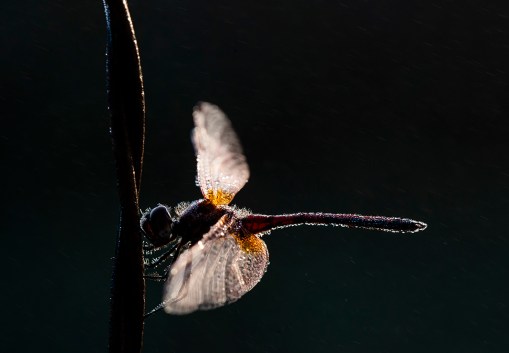 A dragon fly catches the early sunlight through the mist