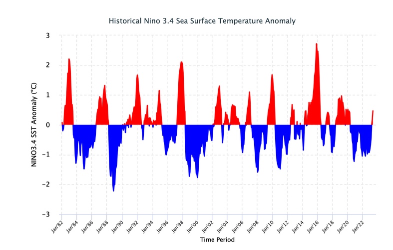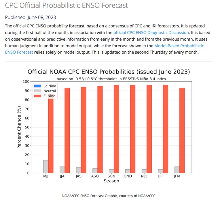 The ENSO forecast for ’23/’24 showing a very high probability of a el Nino event.