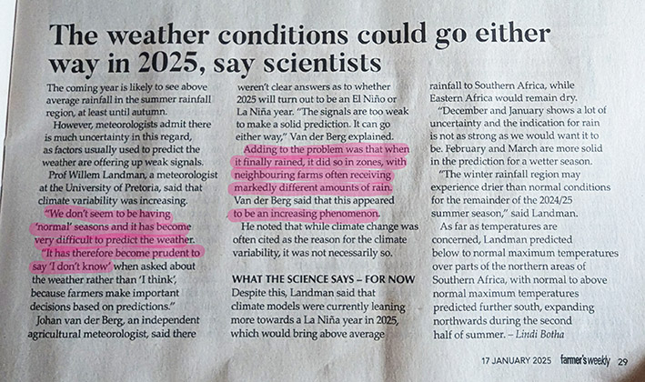A January issue of the South African Farmer’s Weekly magazine echoes the inconsistency of rainfall over small distances and the increased difficulty in making accurate forecasts