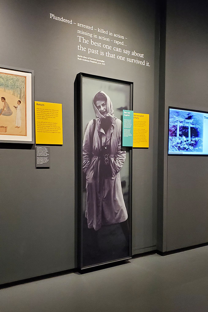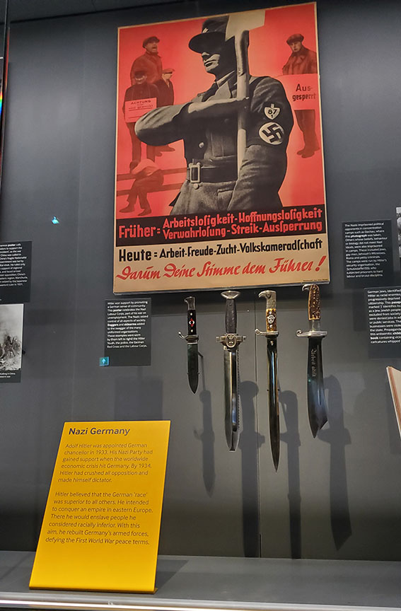 For me it was a crystal clear reason why we never want to go to this extreme again. By the end of the display I was more than a little depressed but the final straw was the video of bodies being bulldozed into mass graves in the German death camps. As a veteran of a vastly smaller conflict I have seen more than a few dead bodies but this made me feel ill.