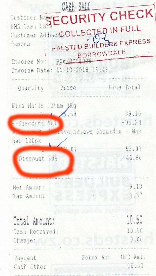 Our gardener comes from the rural north of the country and he says that there the US dollar holds sway – don’t bother offering local dollars. My senior foreman comes from the east and there the local dollar is still acceptable in some situations. While it’s not illegal to price in US dollars it is illegal to convert it to the local equivalent at anything but the official rate which is determined by the central bank’s (Reserve Bank of Zimbabwe) daily auction rate. Senior figures at a local company were charged for this infraction and I have noticed that signs claiming the rate of exchange used in their outlets became prominently displayed. Everyone else is ignoring it and the black market rate continues to climb. It’s now around 200 local dollars to 1 US dollar whereas the official rate is 105.