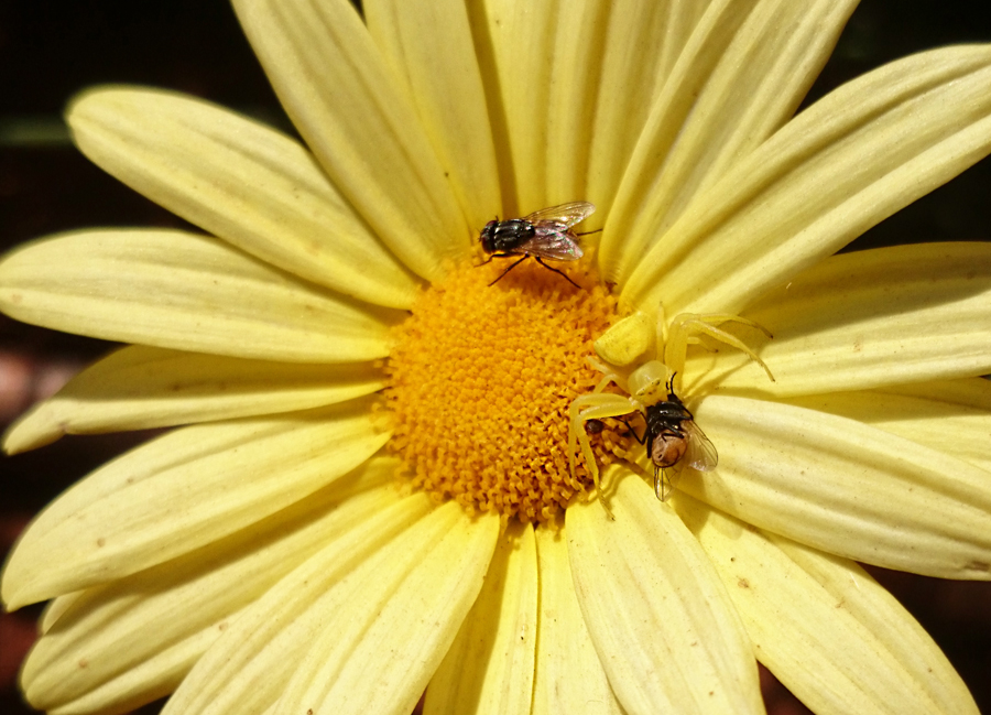 I have seen this type of spider on cosmos and it was white to match the flower. I wonder if they have the ability to change colour depending on the background or they have to spend their life on the plant to get the right colour? It was pure luck to see it with a fly as when I took the first photo it was just patiently waiting.